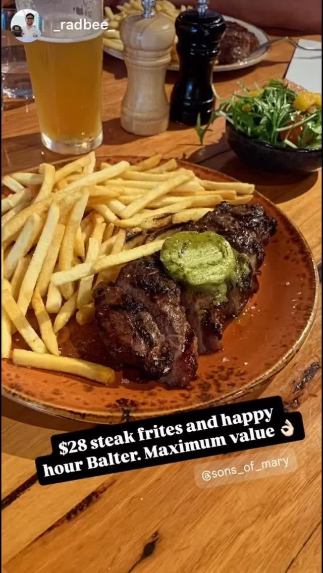 Sons of Mary Café in Brighton is now open for Monday night dinners! Introducing Steak Frites- 250g carved porterhouse with crispy fries and your choice of red wine jus or café de Paris butter for just $28.