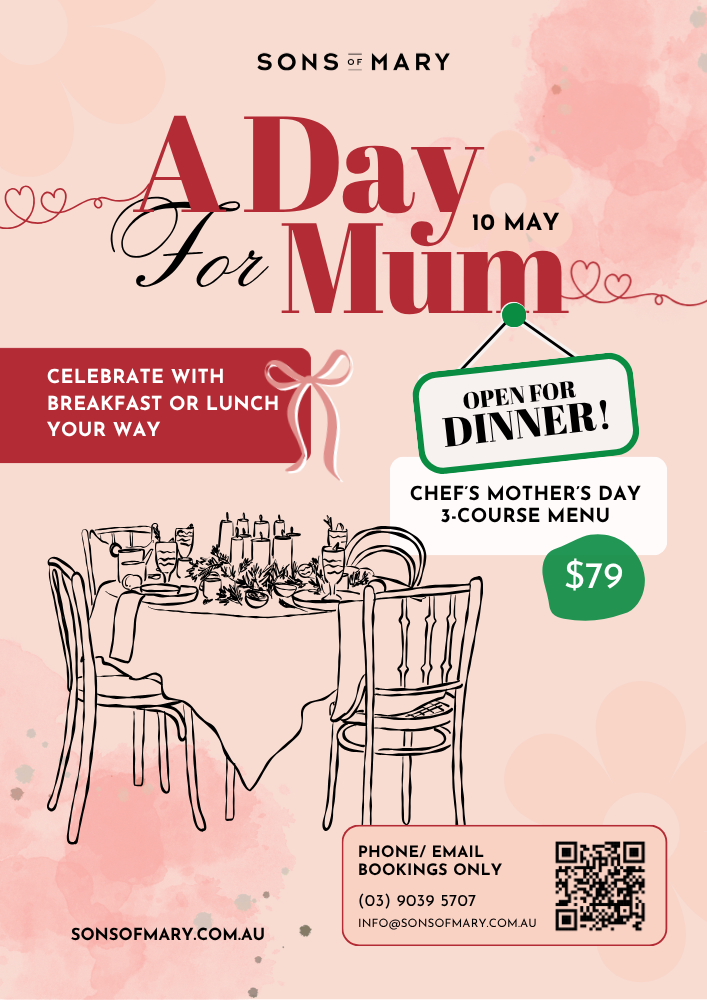 Sons of Mary will open for a special Mother’s Day dinner, featuring a thoughtfully curated three-course menu for $79 per person. Enjoy shared entrées, your choice of main, and alternate dessert, designed to make the occasion feel just that little bit more special.